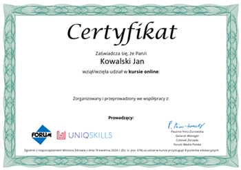 Jesteśmy dumni z tego, że nasz kurs daje uczestnikom możliwość zdobycia certyfikatu potwierdzającego zdobyte umiejętności i wiedzę. To ważne osiągnięcie, które może pomóc w rozwoju kariery i otwierać nowe możliwości zawodowe.